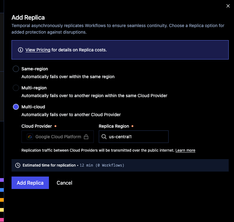 Temporal Cloud's High Availability features allow you to migrate a Temporal Cloud Namespace from one region or cloud provider to another with zero downtime.